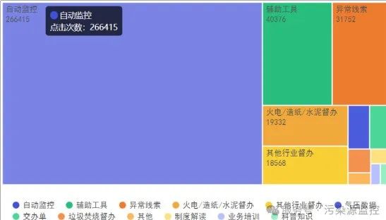 秉持专业精神,我们深挖各类污染源监控的关键数据,优化服务号的功能菜单,提高用户参与污染源自动监控的便捷性,污染源服务号底部功能菜单,全年总点击次数超71万次。其中用户最喜欢在服务号点击“自动监控”查看数据,点击次数达266415次,其次“辅助工具”“异常线索”菜单点击次数分别为40376次、31752次,反映用户对此三个功能模块更感兴趣,使用最频繁。