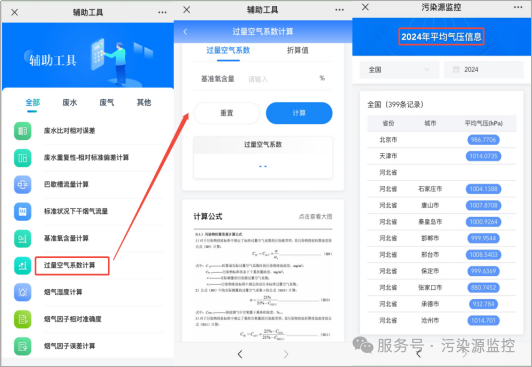 用户可以借助辅助工具对现场端的数据进行演算,如巴歇槽流量计算、基准氧含量计算、过量空气系数计算、烟气因子误差计算等,还可以查看各地方年平均气压的数据,用于仪器设备标杆流量的换算。目前已更新2024年最新年平均气压值。