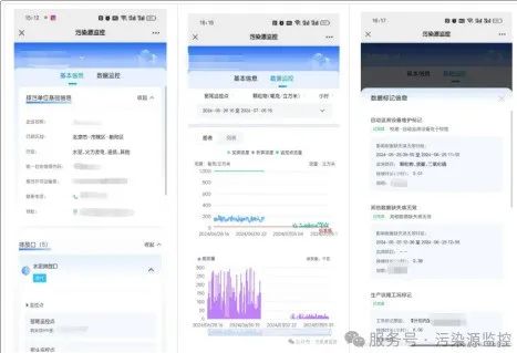 查看排污单位基本信息、按日、小时和分钟等数据类型查询自动监测数据(浓度、排放量)以及查看相应时间段数据标记的功能。